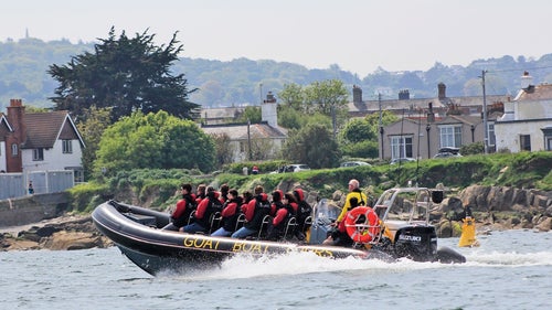 All aboard “Billy Goat,” our Gold Standard RIB, powering across Dublin Bay with a powerful 300hp engine.